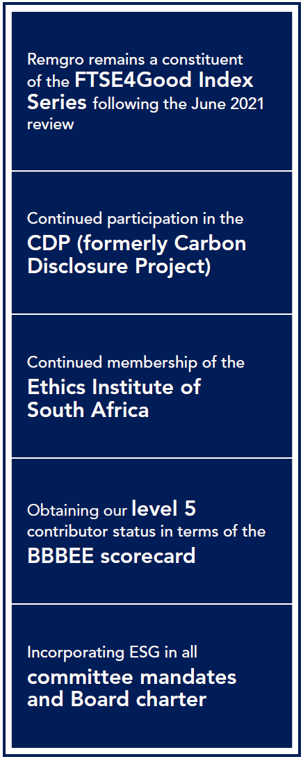 Remgro is fully committed to managing its business sustainably and upholding the highest standards of ethics and corporate governance practices. While corporate governance, risk and opportunities management and technology and information governance are addressed in the Corporate Governance and Risk and Opportunities Management Reports, the Sustainable Development Report provides a better understanding of Remgro’s efforts on the social and environmental front as it pursues the maximisation of value creation over the short, medium and long term. Refer to the sustainability highlights on the previous page for Remgro’s external recognition and achievements during the reporting period in this regard.