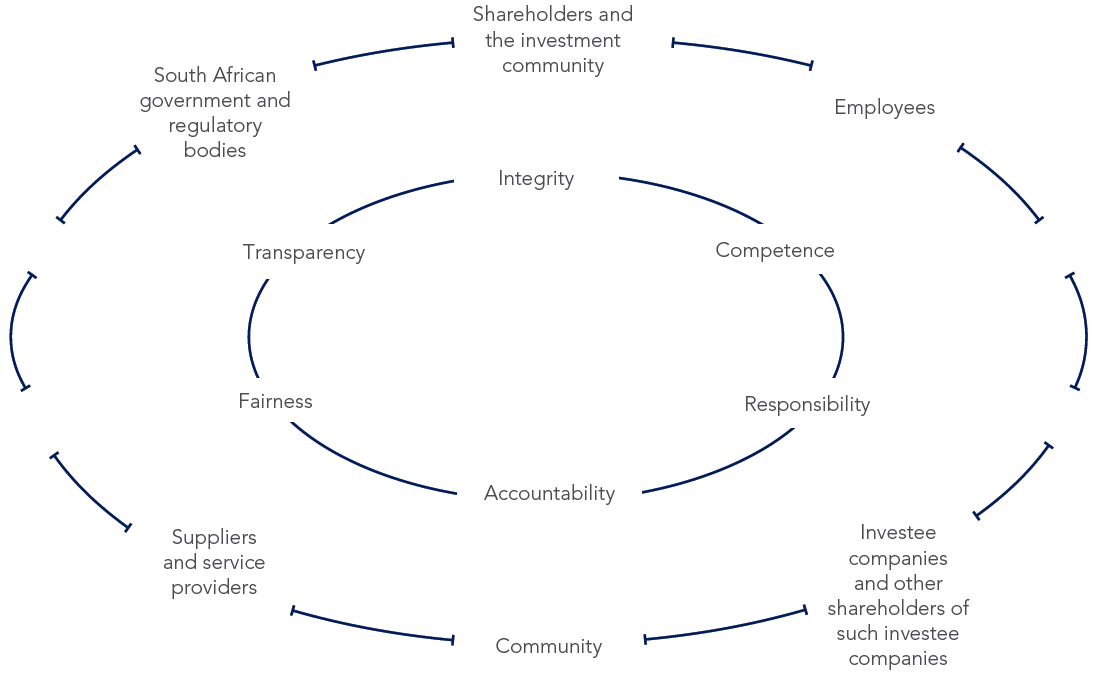 Our relationship with all our stakeholders is based on the following values that are entrenched and supported by Remgro’s Code of Ethics, and which values assist the effective leadership by the Remgro Board in achieving strategic objectives and positive outcomes over time: