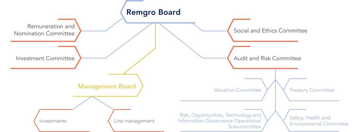 The Remgro Limited Board of Directors ultimately leads and controls the Group in all issues of a material or strategic nature, which can impact the reputation and performance of the Group. The Management Board is a subcommittee of the Remgro Board that is mainly responsible for determining policies, monitoring and managing existing investments, identifying and recommending new investment opportunities and executing the decisions and strategy of the Board. Other issues, as mandated by the Board, are dealt with at senior management level as permitted in terms of a formal delegation of authority that directs limits of delegation and approval mandates.
