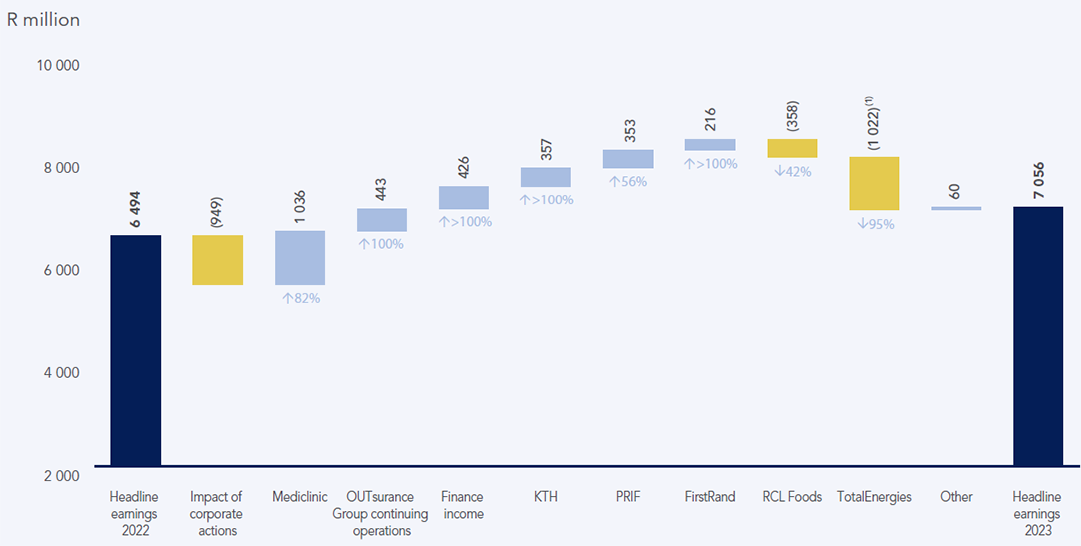 Total earnings decreased by 26.8% to R9 624 million (2022: R13 139 million) mainly due to Remgro’s portion of the profit realised by OUTsurance Group on the unbundling of its investments in Discovery and Momentum Metropolitan (totalling R4 667 million) and the disposal of its investment in Hastings (R1 465 million), accounted for in the comparative year, partly offset by the profit realised on the Distell/Heineken transaction (R3 384 million) during the year under review.