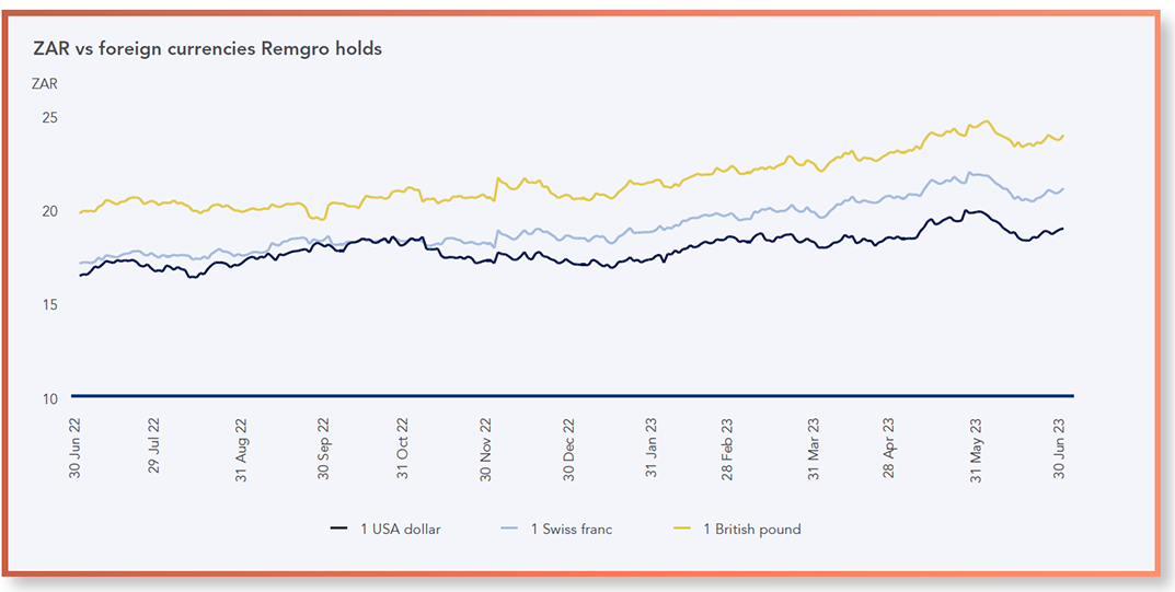 Foreign exchange profits amounting to R386 million (2022: R299 million) were accounted for during the year under review, mainly due to the weakening of the SA rand against the USA dollar from R16.30 = $1.00 at 30 June 2022, to R18.83 = $1.00 at 30 June 2023. For accounting purposes these exchange movements are accounted for directly in equity.