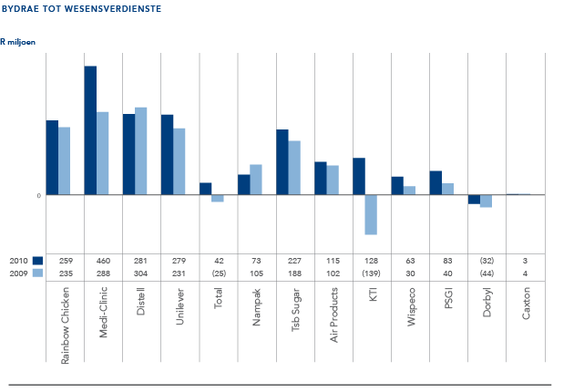 Vir die die jaar geëindig 31 Maart 2010 het Rainbow Chicken Beperk (“Rainbow”) se wesensverdienste met 10% (2009: afname van 40%) van R319 miljoen tot R351 miljoen toegeneem. Positiewe billike waarde aanpassings op finansiële instrumente, wat in Rainbow se grondstofaankoopstrategie gebruik word, ten bedrae van R52 miljoen (2009: R153 miljoen negatief), is by wins voor belasting ingesluit. Met die uitsluiting van hierdie billike waarde aanpassings is daar ’n dalende tendens in wesensverdienste, wat hoofsaaklik toeskryfbaar is aan laer hoenderrealiserings en die eksterne voerbesigheid se kleiner bydrae.